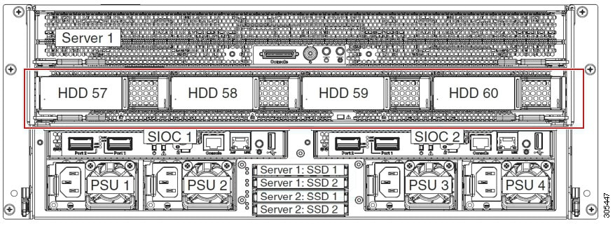 次の図は、HDD 拡張トレイに 4 つの追加ディスク スロットを備えた Cisco UCS S3260 シャーシ を示しています。