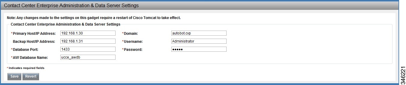データベース設定を指定するには、[Contact Center Enterprise Administration & Data Server Settings] ガジェットを使用します。 これらの設定は、Finesse のエージェントおよびスーパーバイザに対して認証を有効にするために必要です。