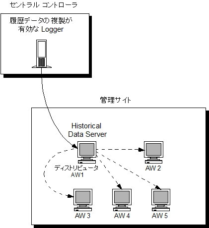 各クライアント アドミン ワークステーションは、リアルタイム供給情報によって履歴データの入手先を通知されます。 リアルタイム ディストリビュータが Historical Data Server である場合、リアルタイム ディストリビュータは、HDS から履歴データを取得するようクライアントに指示します。 そうでない場合、リアルタイム ディストリビュータは、Logger から履歴データを取得するようクライアントに指示します。
