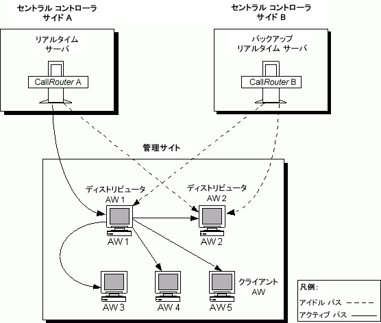 アドミン ワークステーションは、コール センターまたは別のサイトの、セントラル コントローラの一方または両方のサイドに配置できます。 AW が配置されているサイトは管理サイトと呼ばれます。 各管理サイトには最低 1 つのディストリビュータ AW が必要になります。 リアルタイム データ配信アーキテクチャで耐障害性を確保するには、ディストリビュータ AW を 2 つ使用する必要があります(図 10-1 を参照)。