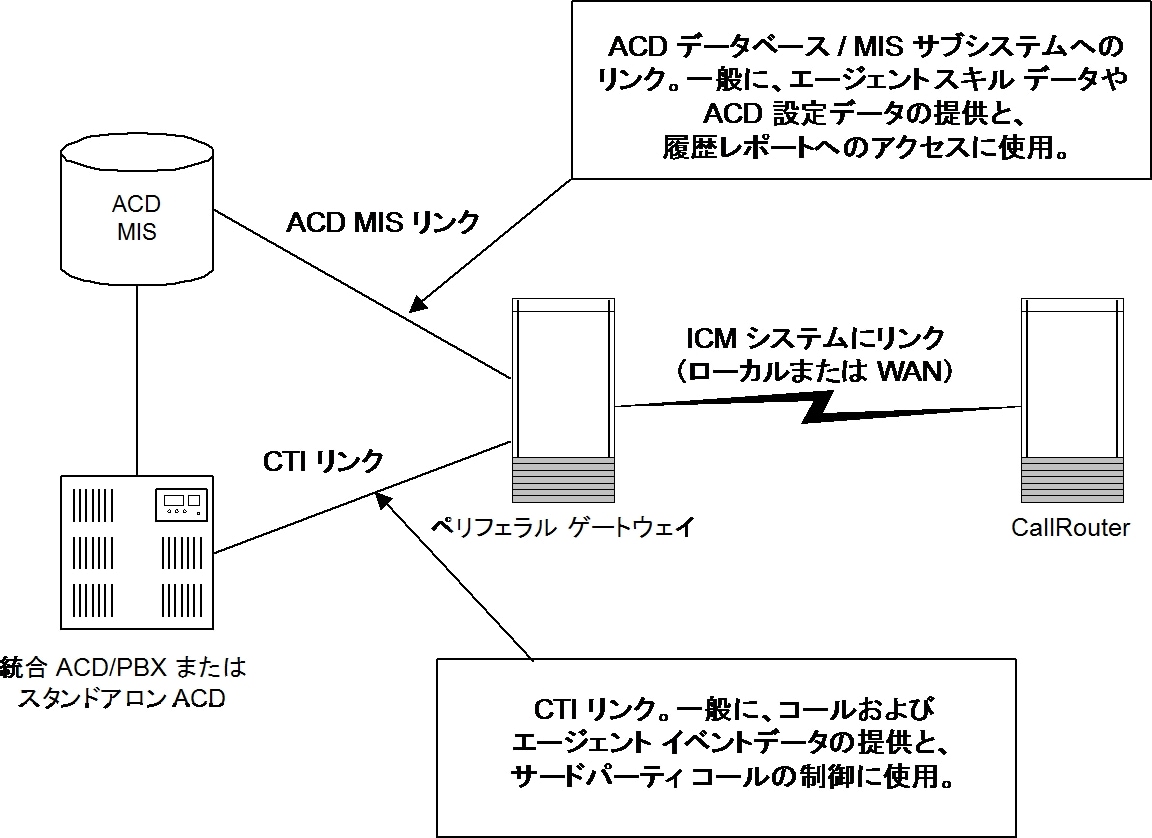 PG とペリフェラルの接続は、ペリフェラルの Computer Telephony Integration(CTI; コンピュータ テレフォニー インテグレーション)リンク経由で行われます。 また、PG がペリフェラルの MIS サブシステムと接続されている場合もあります。 MIS サブシステムは、別のハードウェア プラットフォーム上にある場合や、ACD、PBX、または IVR と統合されている場合もあります。 ACD システムに対するペリフェラル ゲートウェイの関係を図 4-1 に示します。