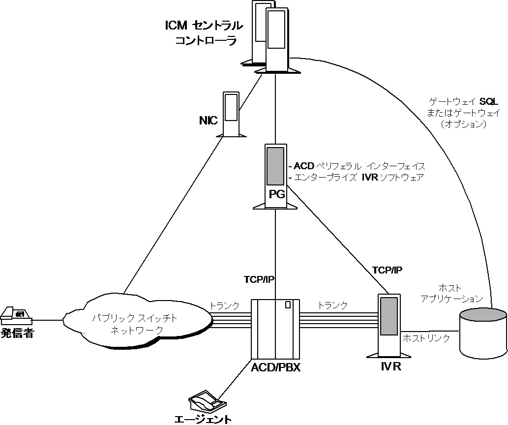 IVR インターフェイス ソフトウェアは、標準 PG ハードウェア プラットフォーム上のプロセスとして動作します。 このソフトウェアを使用すれば、ICM ソフトウェアで IVR 上のターゲットにコールをルーティングしたり、IVR からデータを収集してコール ルーティング、リアルタイム モニタリング、および履歴レポーティングに使用できるようになります。