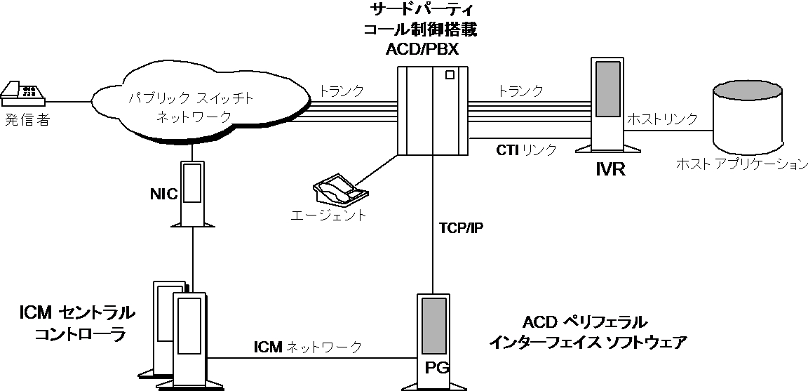 この構成では、IVR はネットワーク サービス プロバイダーによってサービスとして提供されます。 PG は、ACD を監視し、コール ルーティングおよびレポーティングで使用するためにデータを ICM システムに転送します(図 7-5)。