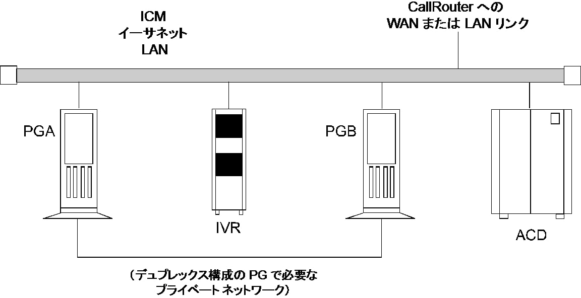 図 7-8 では、デュプレックス構成の 1 組の PG が、IVR システムと ACD システムの両方に接続されています。 これらの PG には、ACD と IVR の両方のインターフェイス ソフトウェアが装備されます。