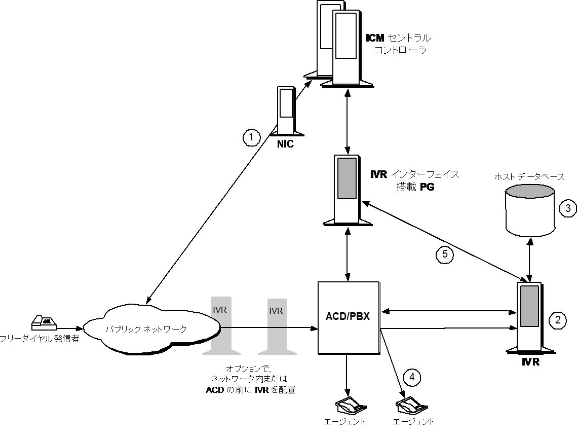 IVR を含む ICM 構成では、IVR にコールを送信できるように ACD を設定します。 図 7-1 に、ICM システムにおける IVR の機能をいくつか示します。