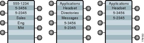 この電話機は、さまざまな方法で設定できます。一般的な回線ボタン設定では、アプリケーションが回線ボタン 24 に、ヘッドセットが回線ボタン 23 に割り当てられます。たとえば、ヘッドセットの有効と無効を切り替えるには、回線ボタン 23 を押します。