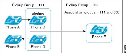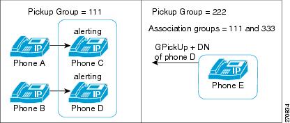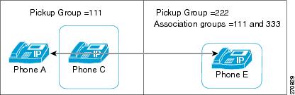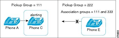 [現在の関連付け先コールピックアップグループ(Current Associated Call Pickup Groups)] 領域にある関連付け先コール ピックアップ グループ リストにメンバを追加するには、このリストから DN/パーティションを選択し、[関連付け先コールピックアップグループに追加(Add to Associated Pickup Groups)] をクリックします。 設定されたグループが自動的に [現在の関連付け先コールピックアップグループ(Current Associated Call Pickup Groups)] のリストに追加されます。 これによって、[他グループ] ソフトキーを使用して、ユーザがいるグループ内のコールを受けることができるようになります。 |