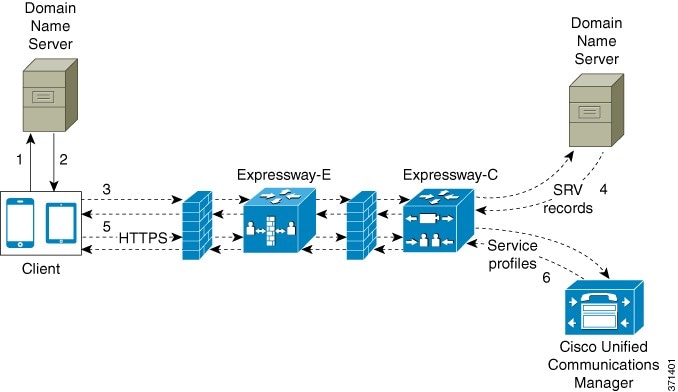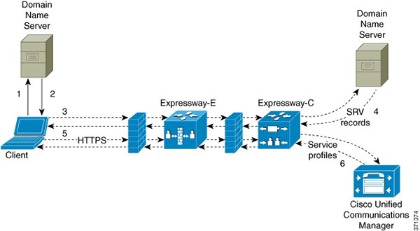 - クライアントは Expressway for Mobile and Remote Access を介して内部ネットワークへに接続してサービスを検出するよう試行します。
