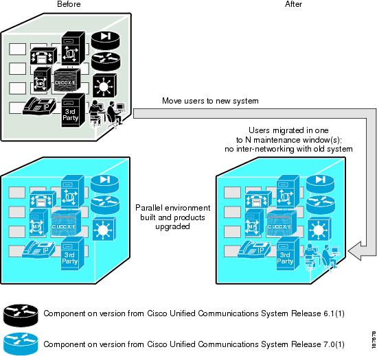新しいハードウェアを使用して Cisco Unified Communications System パラレル ネットワークを構築し、既存の実働ネットワークをサポートするためにプレステージ設定を行う必要があります。その後、単一のメンテナンス期間(flash-cut を使用)または複数のメンテナンス期間(shrink-and-grow を使用)のいずれかで、すべてのユーザを既存の実働ネットワークから、ターゲット リリース セットのソフトウェアで動作する新しいネットワークに移動します。