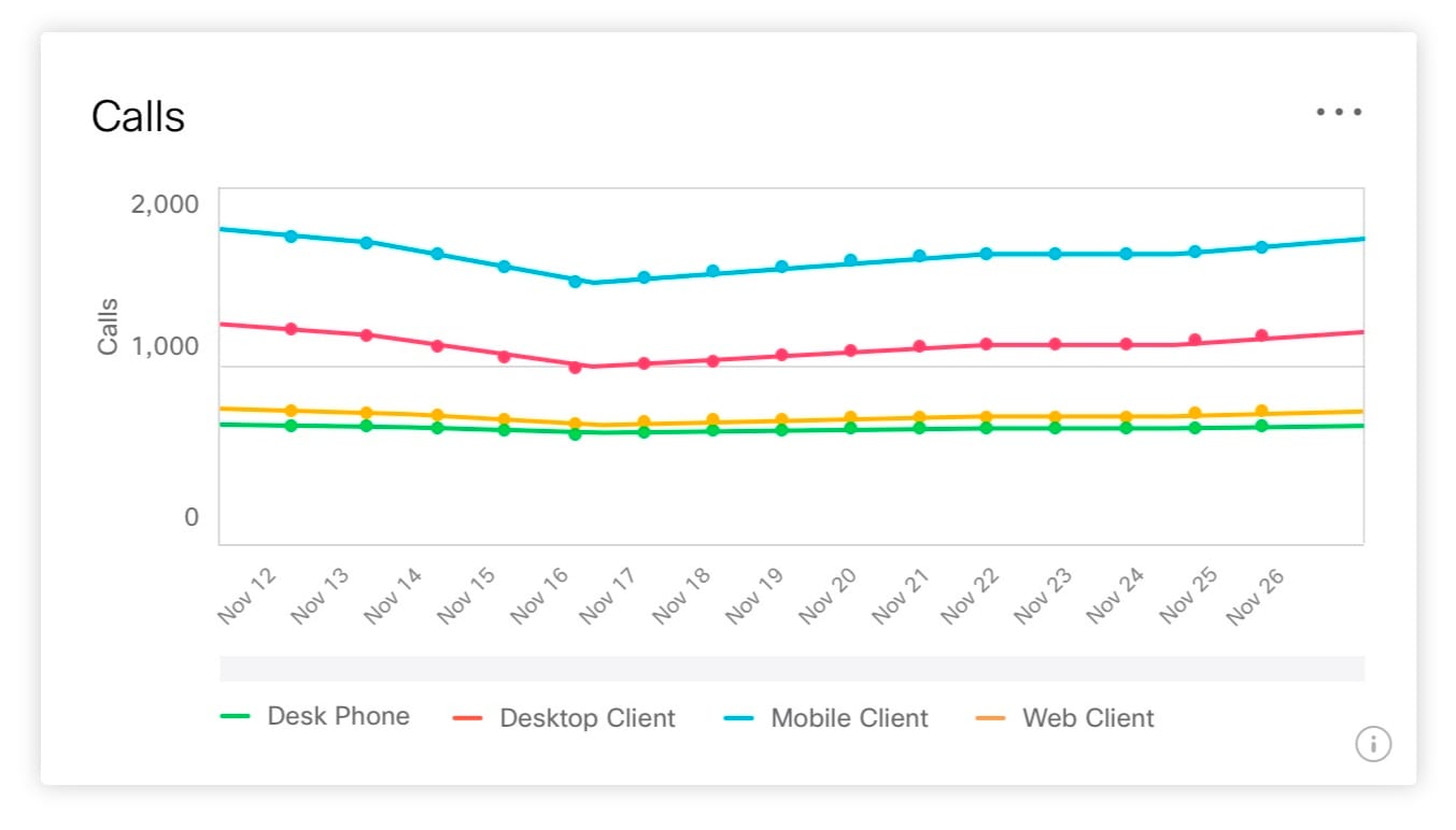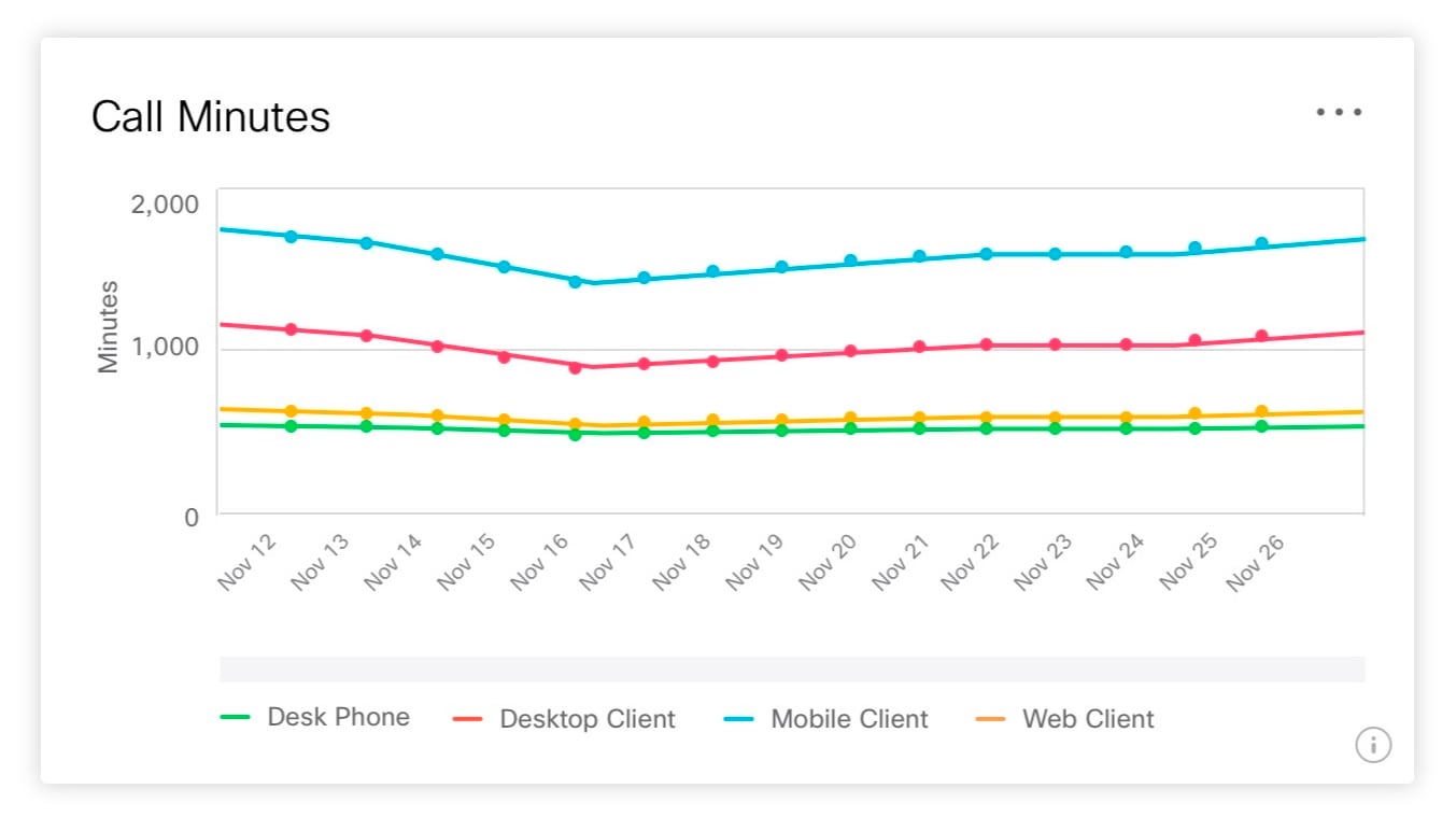 使用されているクライアントとデバイスによって、通話の合計時間を決定できます。クライアントには、ユーザのデスクトップ(Windows または Mac)、モバイルデバイス(iPhone、iPad、または Android)、Web ブラウザ、および Webex Calling ソフトクライアントに Webex Teams アプリが含まれています。デバイスには、クラウドに登録された Cisco Webex Board デバイス、クラウドに登録されたルームデバイス、Webex Calling に使用されている Cisco MPP フォンが含まれています。