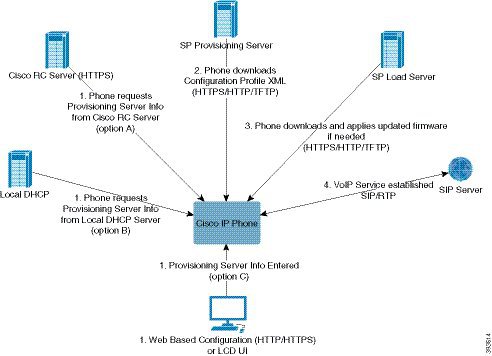 電話は、リモート サーバから設定プロファイルまたは更新されたファームウェアをダウンロードするようにプロビジョニングすることができます。ダウンロードは、電話がネットワークに接続されたとき、電源が投入されたとき、および設定された時間間隔で実行される場合があります。プロビジョニングは、通常、サービス プロバイダーに共通する大規模 Voice-over-IP(VoIP)導入の一環として行われます。設定プロファイルまたは更新されたファームウェア、あるいはその両方は、TFTP、HTTP、または HTTPS を使用してデバイスに転送されます。