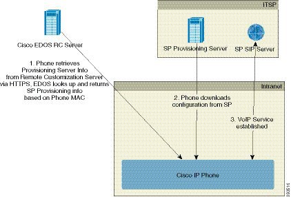 RC 配信モデルでは、Cisco EDOS RC サーバで特定のサービス プロバイダーにすでに関連付けられている Cisco IP Phone を顧客が購入します。インターネット テレフォニー サービス プロバイダー(ITSP)は、プロビジョニング サーバを設定および保守し、Cisco EDOS RC サーバにプロビジョニング サーバ情報を登録します。