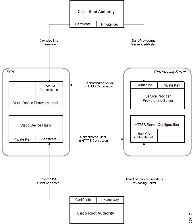 サーバ証明書とクライアント証明書の組み合わせにより、リモートCisco IP Phone とそのプロビジョニング サーバ間のセキュア通信が保証されます。図 4-1 には、Cisco クライアント、プロビジョニング サーバ、および認証局間での、証明書、公開キー/秘密キーのペア、および署名するルート認証局の関係が図示されています。