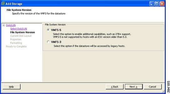 [ファイルシステムのバージョン(File System Version)] ページで [VMFS-5] を選択し、[次へ(Next)] をクリックします。