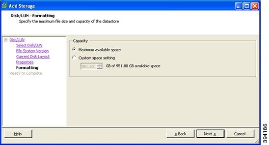 [フォーマット(Formatting)] ページの [使用可能な最大領域(Maximum available space)] を選択し、[次へ(Next)] をクリックします。
