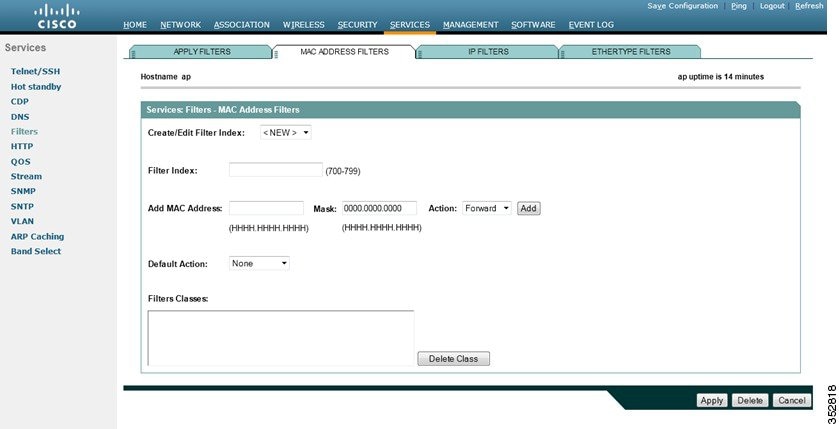 ステップ 7 [Add] をクリックします。追加した MAC アドレスが [Filters Classes] フィールドに表示されます。[Filters Classes] リストから MAC アドレスを削除するには、そのアドレスを選択して [Delete Class] をクリックします。