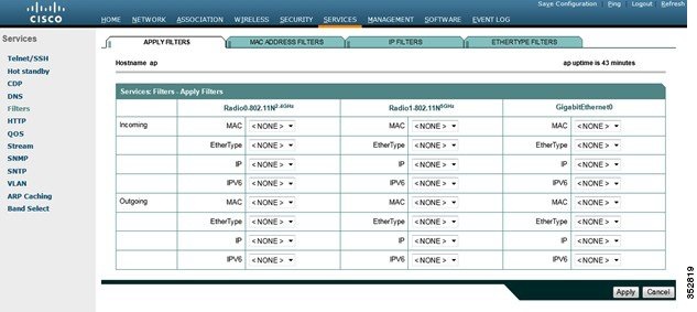 ステップ 9 [Apply] をクリックします。このフィルタはアクセス ポイントに保存されますが、[Apply Filters] ページで適用するまで有効化されません。