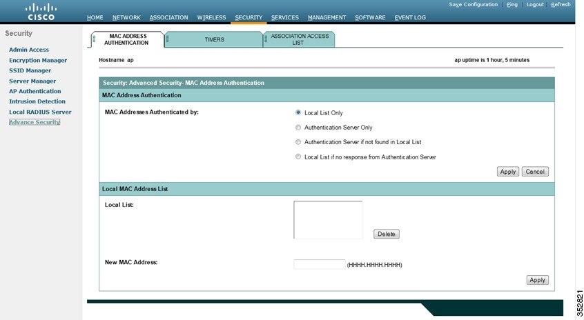 ステップ 3 [Advanced Security] をクリックして、[Advanced Security: MAC Address Authentication] ページを表示します。図 16-4 は、[MAC Address Authentication] ページを示しています。