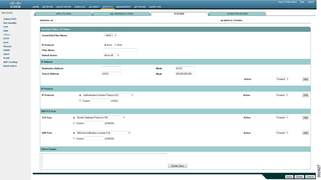 IP フィルタ(IP アドレス、IP プロトコル、および IP ポート)は、アクセス ポイントのイーサネット ポートや無線ポートを経由した特定のプロトコルの使用を許可または禁止するために使用します。また、IP アドレス フィルタを使用して、特定の IP アドレスとの間で送受信されるユニキャスト パケットやマルチキャスト パケットの転送を許可または禁止することができます。指定以外のすべてのアドレスにトラフィックを転送するフィルタを作成することも、指定以外のすべてのアドレスへのトラフィックを排除するフィルタを作成することもできます。IP フィルタ方法の 1 つ、2 つ、または 3 つすべての要素をすべて含むフィルタを作成できます。作成したフィルタは、イーサネット ポートと無線ポートのいずれかまたは両方、および受信パケットと送信パケットのいずれかまたは両方に適用できます。