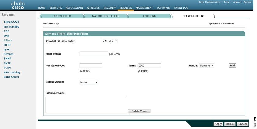 [EtherType Filters] ページを使用して、アクセス ポイントの EtherType フィルタを作成します。図 16-8 は、[EtherType Filters] ページを示しています。