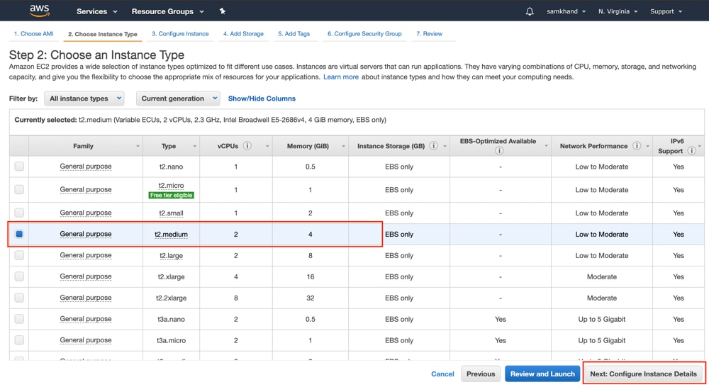 対応する [Type] が [t2.medium]、[vCPU] の値が [2]、[Memory (GB)] が [4] のインスタンスを選択します。