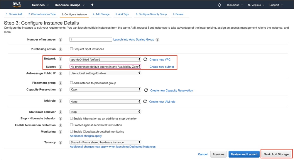 [Network] と [Subnet] を選択します。[Next: Add Storage] をクリックします。