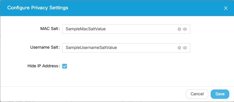 Cisco DNA Spaces:コネクタ GUI の [Privacy settings] を使用して、MAC ソルトとユーザ名ソルトを設定できます。