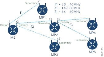 固定インフラストラクチャに関しては、ポイントツーマルチポイント接続を導入するために、Fluidmax モードで動作するようにワイヤレスインターフェイスを設定できます。各インターフェイスは独立した Fluidmax パラメータのセットを使用するため、導入可能なネットワークトポロジの柔軟性が大幅に向上しています。例として、以下の図は、ME(メッシュエンド)ノードが両方の無線機を Fluidmax プライマリモードで使用して、2 つの異なる周波数で複数のセカンダリクライアント(MP1(メッシュポイント)、MP2、および MP3)のために機能する、2 カスケード型ポイントツーマルチポイント クラスタを示しています。MP2 に関しては、最初の無線機は Fluidmax セカンダリモードで動作して ME に接続し、2 番目のインターフェイスは Fluidmax プライマリとして設定されてより多くのダウンストリーム クライアント(MP4 および MP5)のために機能します。
