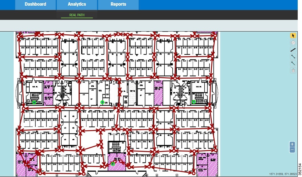 実際のパスの設定を使用すると、ビルディング全体の有効なノードおよびエッジのセットを定義できます。これは、ビジターが選ぶ可能性があるすべてのパスを記載する方向性のあるネットワークを示します。各ビルディングまたはフロアに対してナビゲーション パスを定義し、このネットワークを使用して、最も一般的なパスを表示できます。