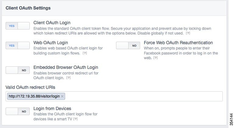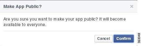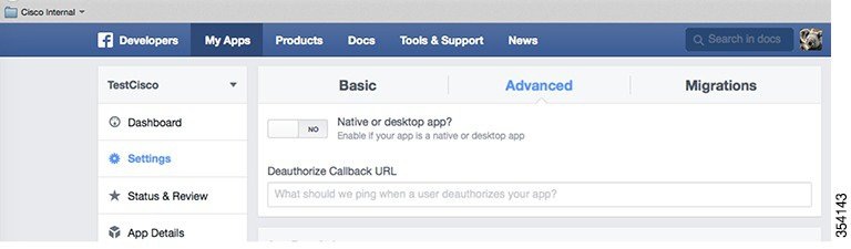 ステップ 13 名、姓、友達リストなどの情報を収集する場合は、Facebook による承認のためこれらのアイテムを送信します。 ステップ 14 Facebook Oauth 設定のためにプライベート IP アドレスを設定するには、[Advanced] タブを選択し、[Valid OAuth redirect URIs] フィールドに http://cmxIP/visitor/login と入力します。 デフォルトでは、[Valid OAuth redirect URIs] フィールドは空白です。