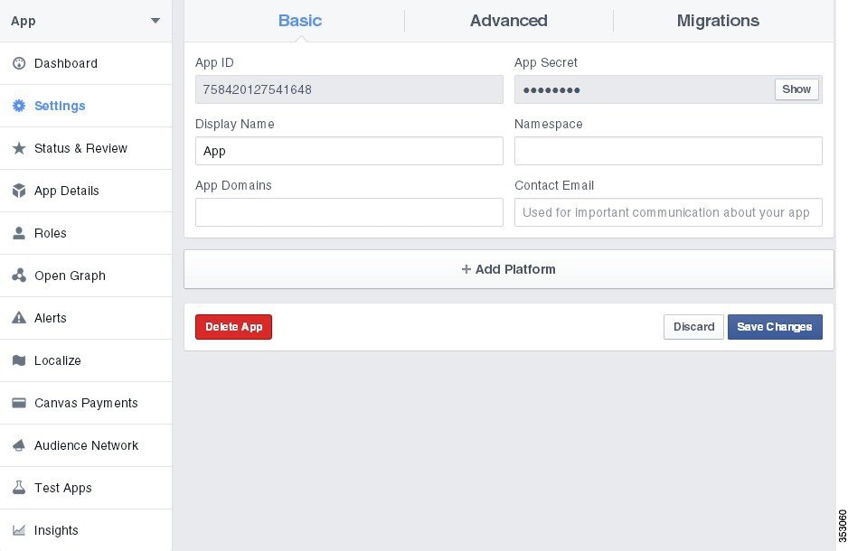 ステップ 8 [Skip to Developer Dashboard] リンクをクリックします。 ステップ 9 後のステップで使用するため、アプリ ID を選択してコピーします。 ステップ 10 左側のナビゲーション ウィンドウの [Settings] をクリックし、連絡先メールを追加し、[Save Changes] ボタンをクリックします。