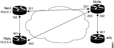 NBMA マルチアクセス ネットワークをブロードキャストまたは非ブロードキャストとして設定する場合は、すべてのルータ間に仮想回線(VC)が存在するか、完全メッシュ ネットワークになっていることが前提となります。たとえば、コストの制約があったり、一部だけがメッシュ ネットワークになっている場合には設定できません。この場合は、OSPF ネットワークのタイプをポイントツーマルチポイント ネットワークとして設定できます。直接接続されていない 2 台のルータ間のルーティングでは、両方のルータへの VC を持つルータを経由してルーティングされます。この機能を使用する場合は、ネイバーを設定する必要はありません。