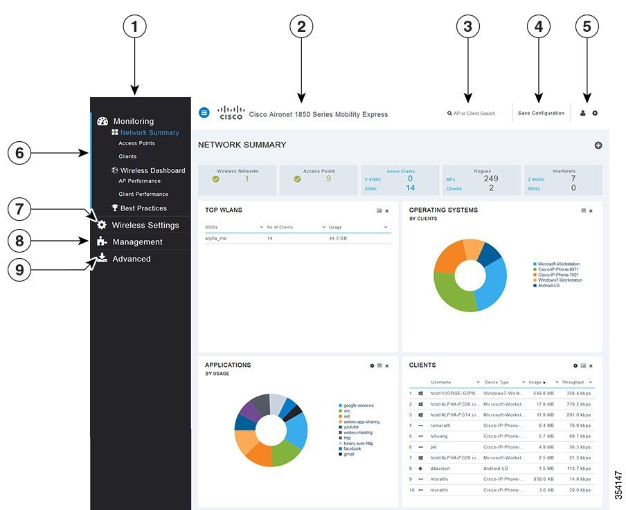 Mobility Express ネットワークの [Monitoring] セクション。 詳細については、Cisco Mobility Express モニタリング サービスについてを参照してください。 |
