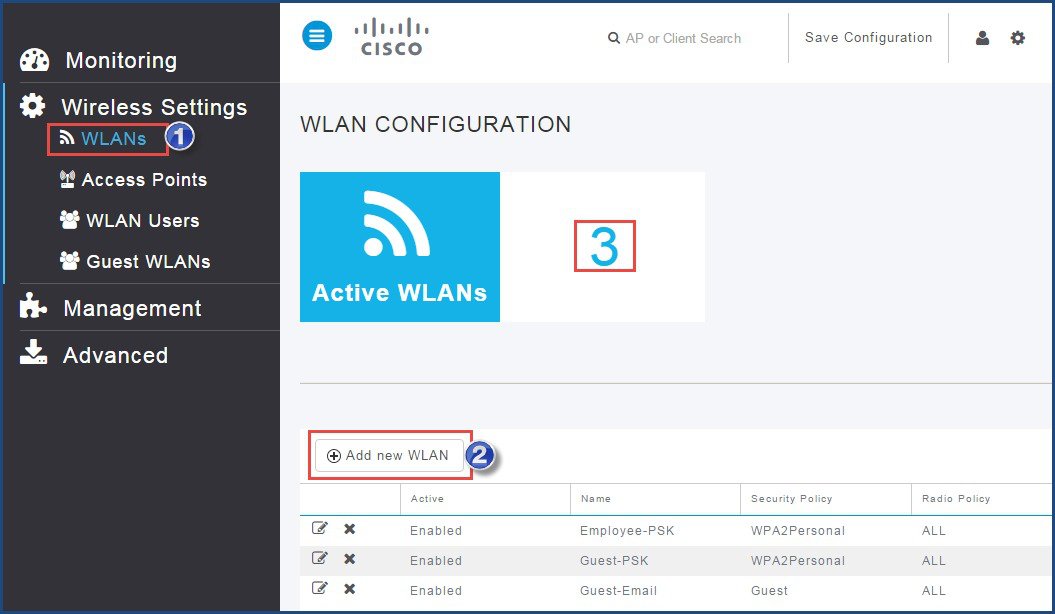 [WLAN の設定(WLAN configuration)] ページが表示され、[アクティブな WLAN(Active WLANs)] の数が示されます。
