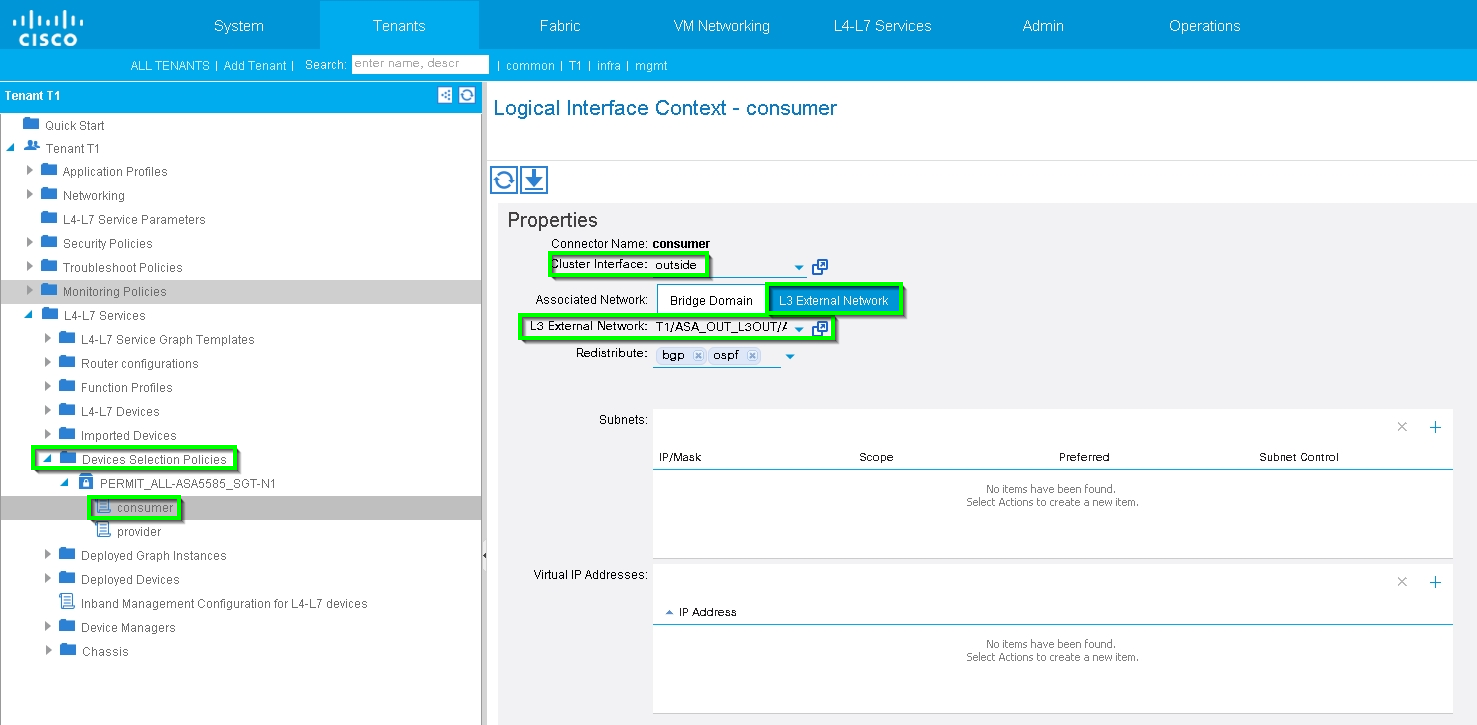 l4l7-peer tenant T1 out ASA_OUT_L3OUT epg ASA_OUT_EXT_NET redistribute bgp,ospf