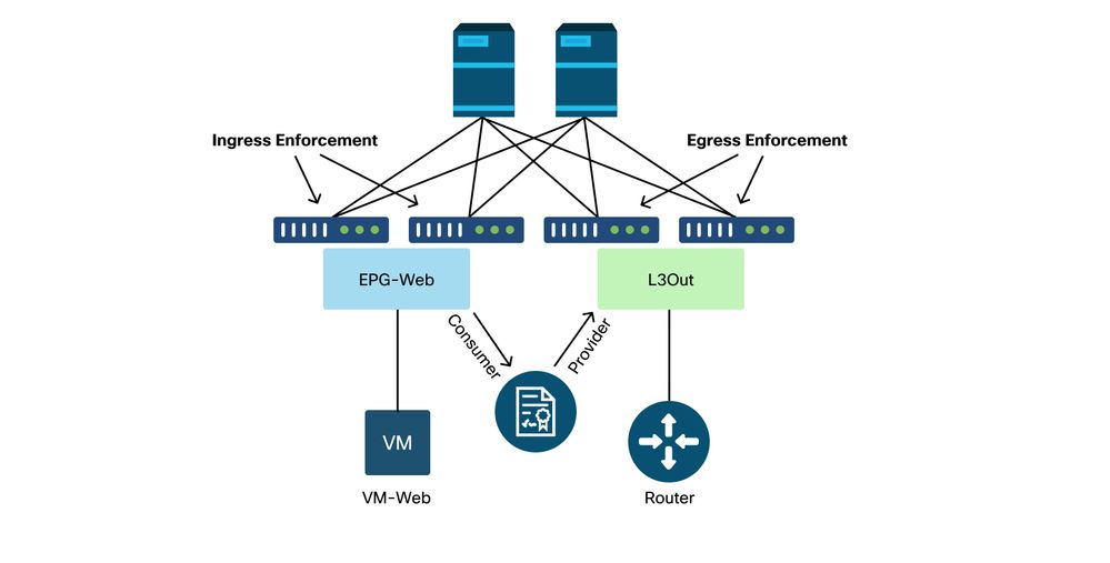 아래 그림에는 EPG-Web을 소비자로, L3Out EPG를 제공자로 사용하는 contract enforcement의 예가 나와 있습니다. VRF가 인그레스 시행 모드로 설정된 경우 EPG-Web이 상주하는 리프 노드에 의해 정책이 시행됩니다. VRF가 이그레스(Egress) 시행 모드로 설정된 경우, VM-Web 엔드포인트가 보더 리프에 학습된 경우 L3Out이 상주하는 보더 리프 노드에 의해 정책이 시행됩니다.