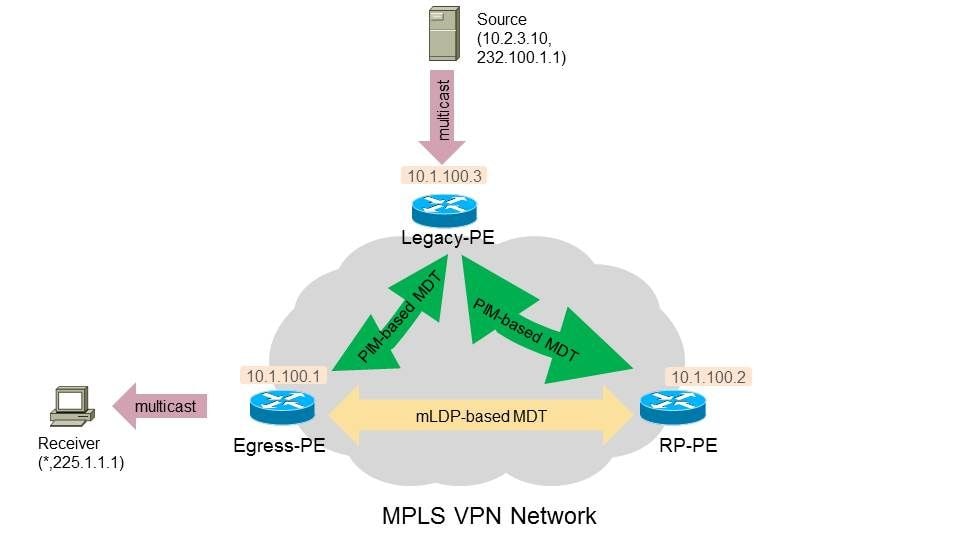 그러나 Egress-PE에는 수신 인터페이스 Lmdt를 가리키는 RPF 정보가 있으며 멀티캐스트 트래픽이 RP-PE에서 해당 MDT에 여전히 도착하므로, 멀티캐스트 트래픽은 수신기로 전달되며 RPF에 실패하지 않습니다. 그 이유는 RPF가 RPF 인접 라우터인 Legacy-PE 라우터에서 멀티캐스트 트래픽이 실제로 도착하는지 확인하기 위해 엄격한 RPF 검사를 수행하지 않기 때문입니다. Lmdt의 PE1에는 10.1.100.3에 대한 PIM 인접성이 없습니다. 레거시 PE는 PIM만 코어 트리 프로토콜로 실행하기 때문에 Lmdt를 가질 수 없기 때문입니다(프로파일 0).