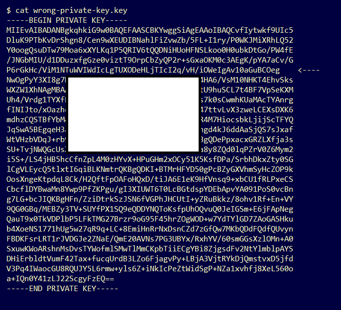 개인 키 파일 내의 PEM 데이터는 64자 줄로 표시됩니다.파일 내의 PEM 데이터를 빠르게 검사하면 데이터가 누락되었는지 확인할 수 있습니다.데이터가 누락된 행이 파일의 다른 행과 정렬되지 않았습니다.