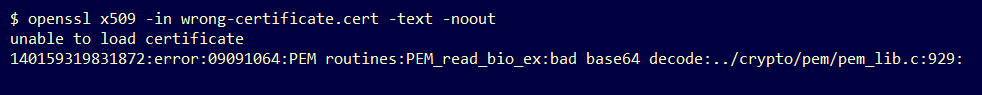 PEM 데이터가 손상된 경우 OpenSSL 툴이 인증서 정보를 로드하려고 시도할 때 오류가 발생합니다.