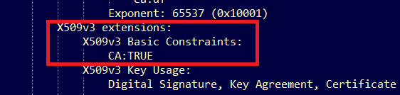 Basic Constraints 확장 값이 CA로 설정된 경우 OpenSSL 툴로 확인합니다.CA 인증서에서 True입니다.