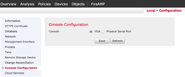 그런 다음 GUI에서 LOM을 활성화한 다음 어플라이언스를 재부팅합니다.어플라이언스의 GUI에서 Local(로컬) > Configuration(컨피그레이션) > Console Configuration(콘솔 컨피그레이션)을 선택합니다. Physical Serial Port 또는 LOM을 선택하고 Save를 클릭한 다음 OK를 클릭하여 재부팅합니다.