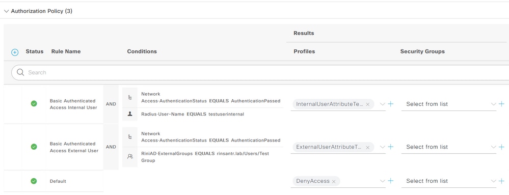권한 부여 정책은 외부 사용자가 AD에 있는 그룹 및 ISE 내부 ID 저장소의 사용자 이름을 기반으로 정책 > 정책 집합에서 구성할 수 있습니다. 이 예에서 testuserexternal은 그룹 rinsantr.lab/Users/Test Group에 있는 사용자이며 testuserinternal은 ISE 내부 ID 저장소에 있는 사용자입니다.