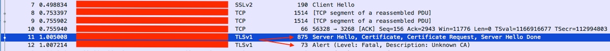 인증서에 잠재적인 문제가 있는지 확인하려면 이러한 행에 대한 디버깅 출력을 확인하십시오.