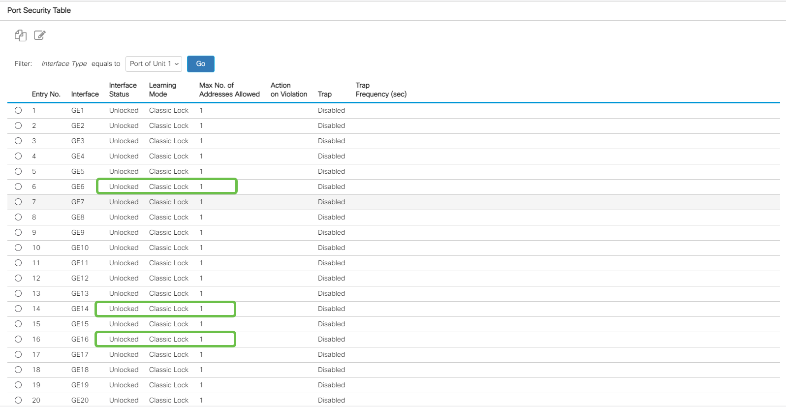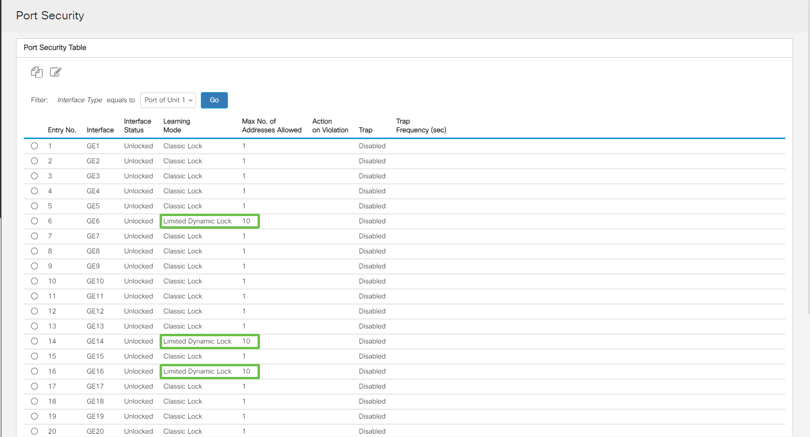 Port Security(포트 보안)로 돌아가 모든 포트가 Classic Lock(클래식 잠금)으로 돌아오고 네트워크 내 디바이스와의 연결을 확인합니다.