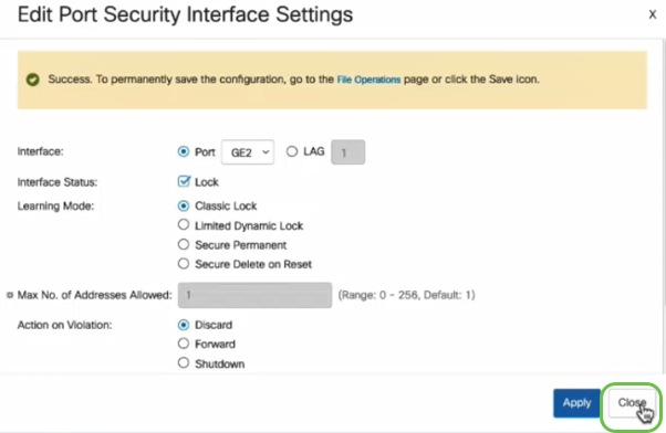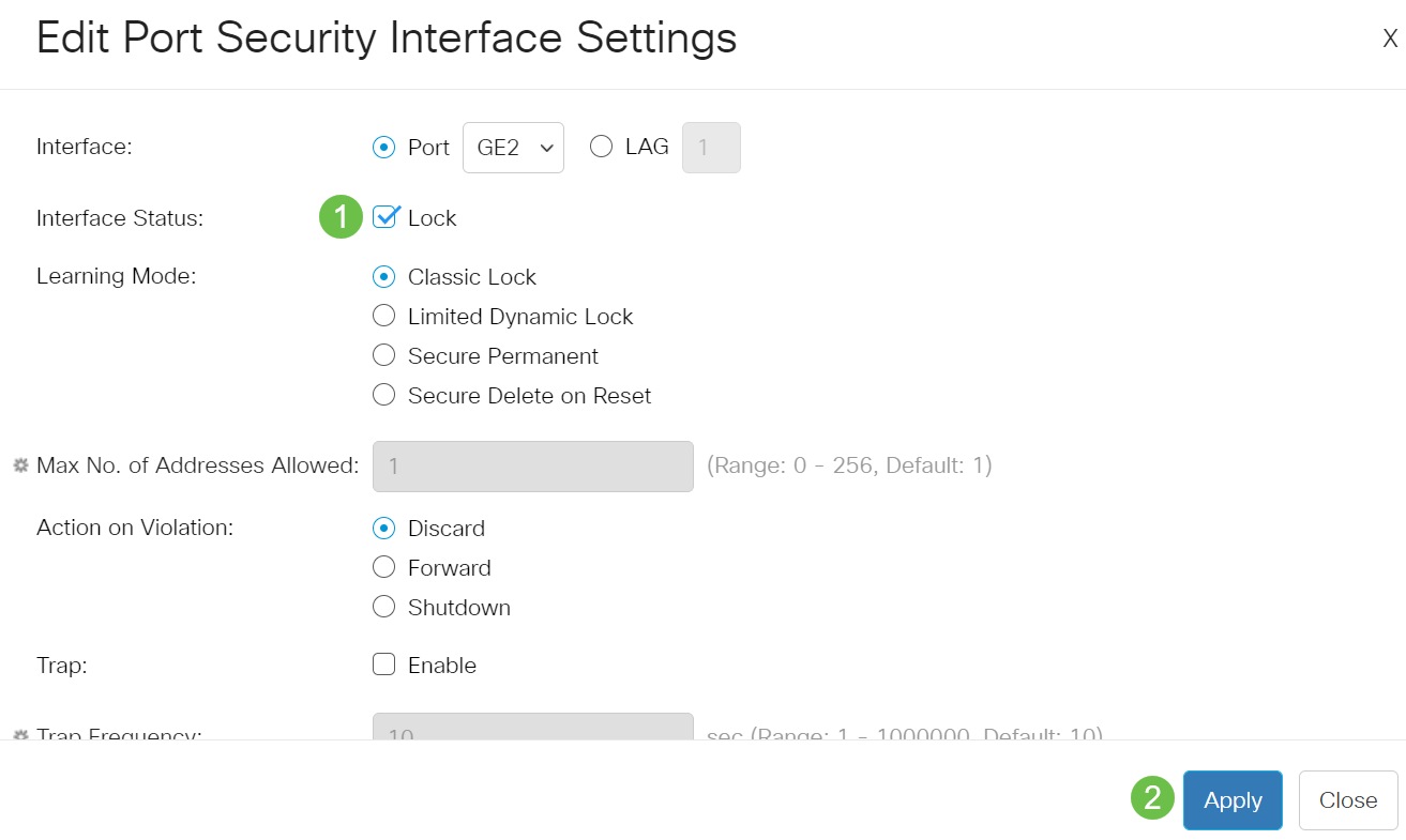 Security(보안) 메뉴로 이동하여 스위치 포트 2(GE2)를 선택하고 수정 아이콘을 클릭합니다. Interface Status(인터페이스 상태) 옆에서 Lock(잠금) 옵션을 활성화합니다. 학습 모드는 클래식 잠금으로 표시됩니다. Action on Violation(위반 시 작업)을 Discard(폐기)로 남겨두고 Apply(적용)를 클릭합니다.