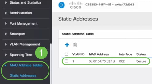 MAC Address Tables(MAC 주소 테이블) > Static Addresses(고정 주소)로 이동합니다. GE2 인터페이스와 연결된 PC MAC 주소는 여전히 Static Addresses(고정 주소) 테이블 아래에 표시됩니다.