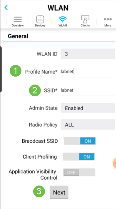 프로파일 이름 및 SSID를 입력합니다.나머지 필드를 채우거나 기본 설정으로 둡니다.Application Visibility Control을 활성화한 경우 6단계에서 다른 컨피그레이션에 대해 설명합니다. 다음을 누릅니다.