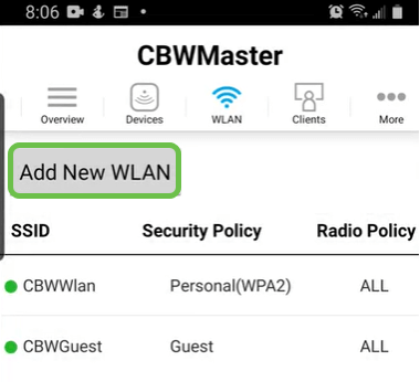 모바일에서 Cisco Business 무선 네트워크에 연결합니다. 애플리케이션에 로그인합니다. 페이지 상단의 WLAN 아이콘을 클릭합니다.