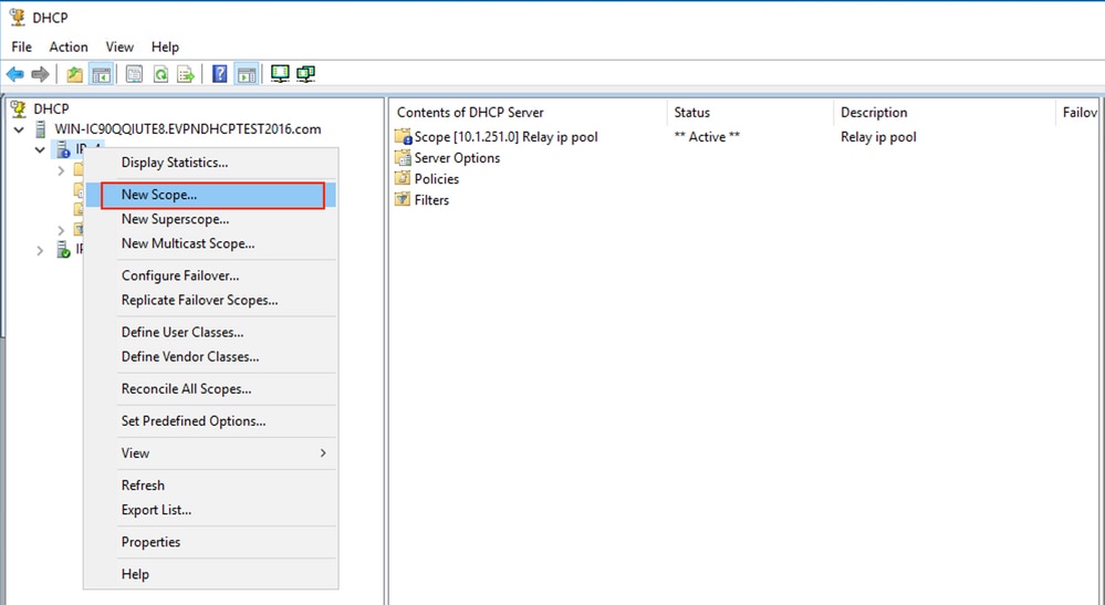 릴레이 주소에 대한 DHCP 범위를 만듭니다. 마우스 오른쪽 버튼을 클릭하고 이미지에 표시된 대로 New Scope(새 범위)를 선택합니다.