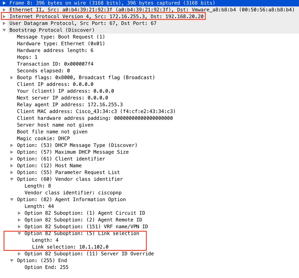 5401 4.402431 172.16.255.3 b^F^R 192.168.20.20 DHCP 396 DHCP Discover - Transaction ID 0x1feb
